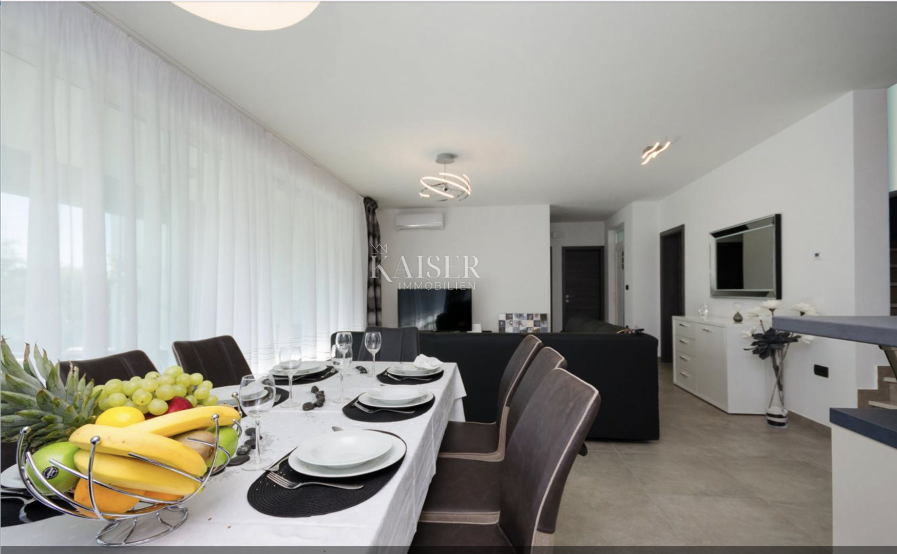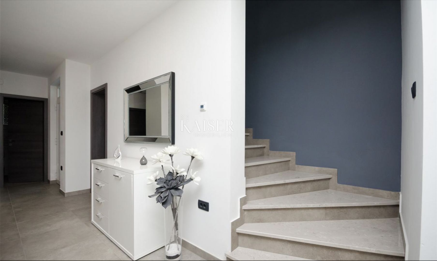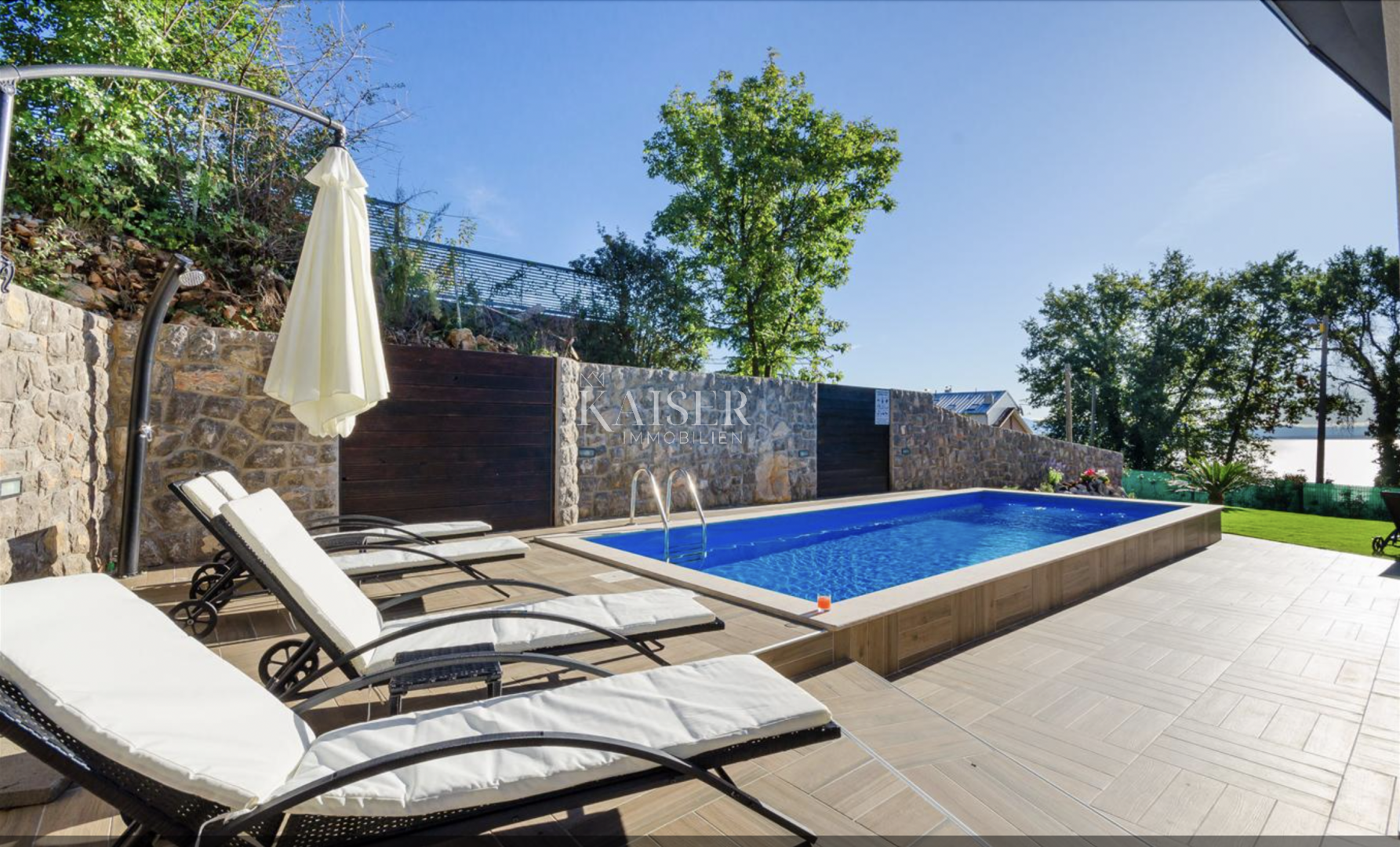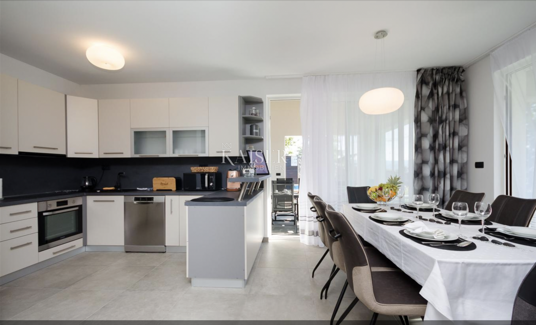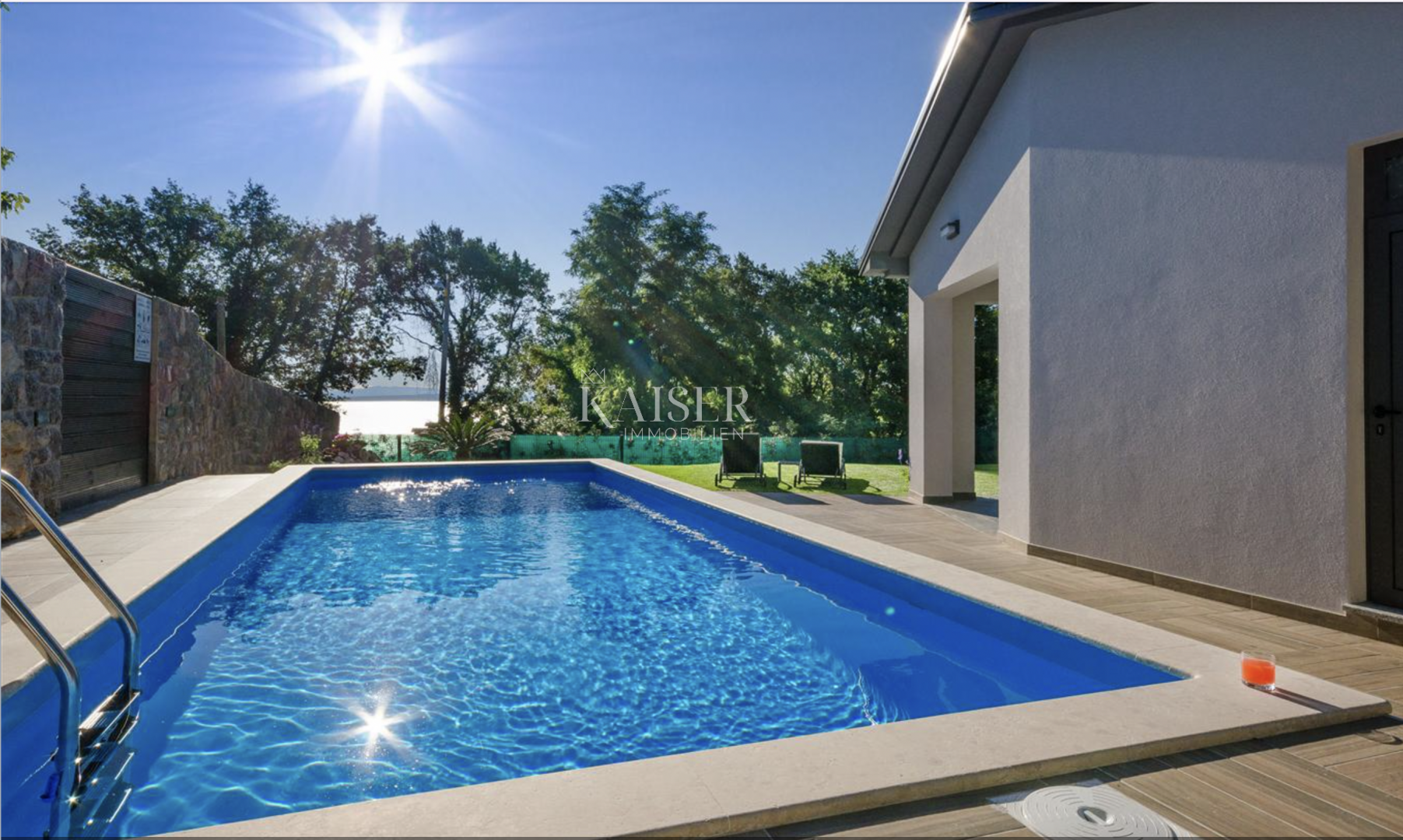 Wir präsentiert Ihnen ein freistehendes Haus mit Swimmingpool in toller Lage, ganz in der Nähe von Lungomare und dem Strand Ičići selbst, befindet sich dieses schöne Haus mit Meerblick. Das Haus hat eine Wohnfläche von 180 m2, erstreckt sich über einen wunderschön angelegten Garten von 630 m2 und besteht aus einem Erdgeschoss und einem ersten Stock. Es ist wunderschön und modern eingerichtet und besteht aus einer geräumigen Küche mit Esszimmer, einem Wohnzimmer mit Zugang zu einer geräumigen Terrasse mit Swimmingpool, einem Grill zum Genießen der Sommertage, einem Schlafzimmer, einem Abstellraum und einem Gästeraum Toilette. Im ersten Stock befinden sich drei Schlafzimmer, jedes mit eigenem Bad. Bei der Dekoration wurde viel Wert auf die Details gelegt, es wurden hochwertige Materialien verwendet. Die Möbel sind Designermöbel und alles ist maßgefertigt. Die Unterkunft liegt sieben Gehminuten vom Strand oder zwei Autominuten entfernt. Das Zentrum von Opatija erreichen Sie innerhalb von zehn Autominuten. Eine ideale Immobilie für ein ruhiges Familienleben, die auf ihren neuen stolzen Besitzer wartet.