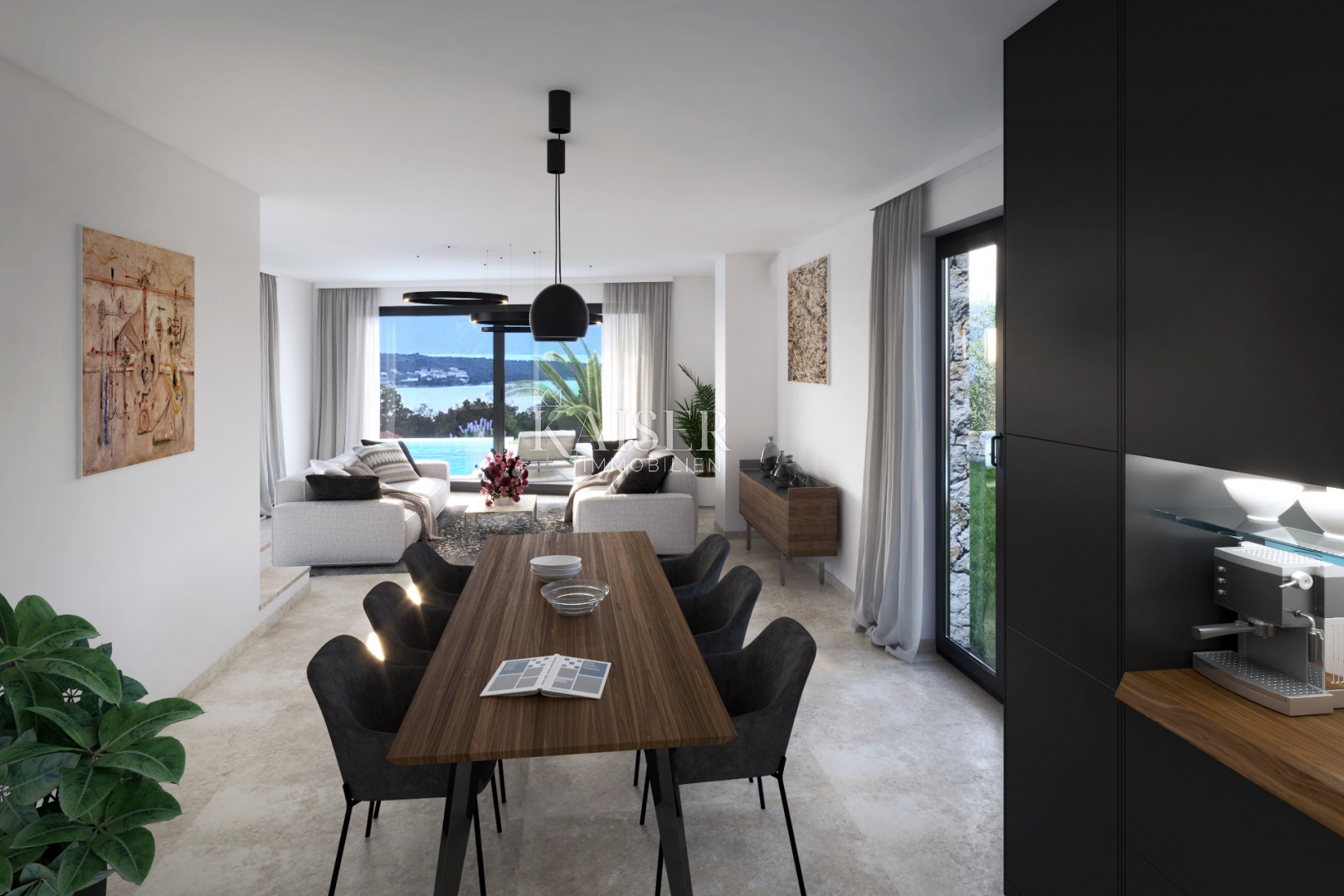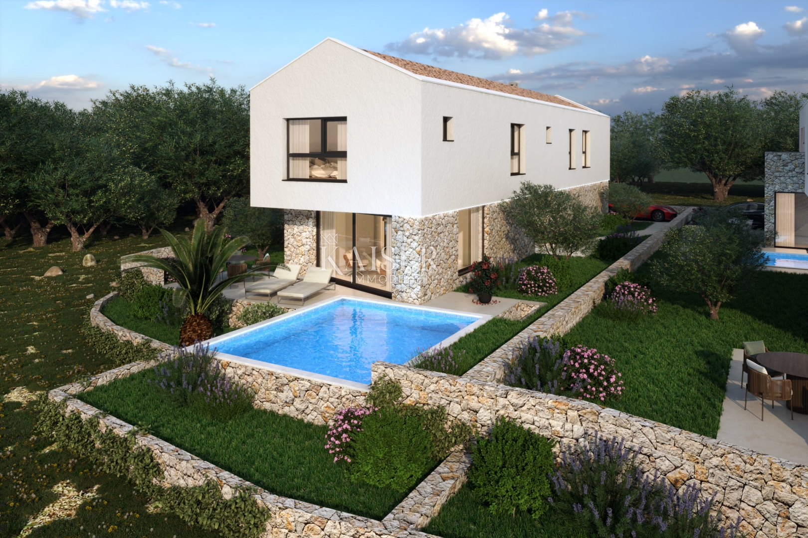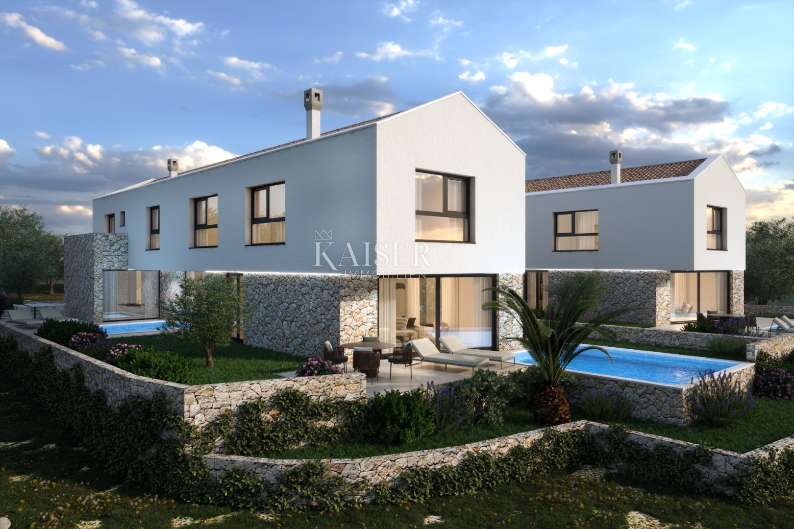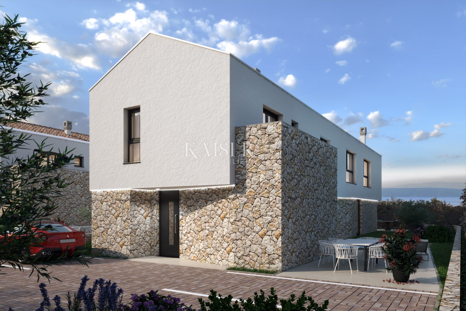 Wir vermittelen den Verkauf einer neu gebauten Doppelhaushälfte in der Nähe von Malinska, Insel Krk. Das Gebäude verfügt über eine Gesamtwohnfläche von 112m2, aufgeteilt auf zwei Etagen. Im Erdgeschoss befindet sich ein großzügiger Wohnbereich von 40 m2, der ein Wohnzimmer, eine Küche und ein Esszimmer sowie einen Abstellraum und eine Toilette umfasst. Eine Innentreppe führt in den ersten Stock, wo sich zwei Schlafzimmer und ein Badezimmer sowie ein Hauptschlafzimmer mit eigenem Bad und Zugang zum Balkon befinden. Für die Einrichtung werden hochwertige Materialien, Boden- und Wandbeläge aus hochwertiger italienischer und spanischer Keramik, hochwertige holzfarbene PVC-Tischlerei und PVC-Jalousien mit Elektromotor verwendet. Das Heizen und Kühlen erfolgt über einen Kaminofen, eine elektrische Fußbodenheizung im Erdgeschoss und in den Badezimmern sowie eine Daikin-Klimaanlage in allen Räumen. Die Außendämmung des Gebäudes besteht aus 10 cm dickem Styropor + abschließender Acrylatschicht und Steinverkleidung im Erdgeschoss sowie 15 cm Dämmung im Dach. All dies führt das ganze Jahr über zu einem äußerst niedrigen Energieverbrauch. Das Dach des Gebäudes besteht aus italienischen mediterranen Ziegeln mit antikem Aussehen. Es gibt einen mit Glasmosaiken ausgekleideten Swimmingpool und ein gepflastertes Sonnendeck sowie zwei gepflasterte Parkplätze im angelegten 99 m² großen Garten. Die Anlage liegt nur 1.500 m vom Meer und dem Stadtzentrum sowie anderen wichtigen Annehmlichkeiten entfernt. Die Fertigstellung ist für Juni 2024 geplant.